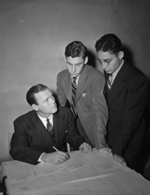 The Golden Gloves state tournament opened Thursday night at Will Rogers Memorial Coliseum. Looking over the records left to right are Walter Paschal, Eddie Russey, and Moses Corona. Paschal, Golden Gloves Secretary, is sitting at a table dressed in a double breasted pinstripe suit. Russey and Corona are representing Wichita Falls, Texas in the Golden Gloves. Russey is wearing a light colored suit. Corona is dressed in a double breasted pinstripe suit.