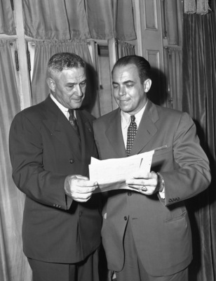 The Texas Safety leaders met with the Fort Worth Citizens Safety Association at the Blackstone Hotel. They outlined plans for a more comprehensive safety program for the city and surrounding area. The safety leaders, left to right, are C. J. Rutland, and George Clarke. Mr. Rutland, of Dallas, Texas, is wearing a double breasted suit. George Clarke, of Austin, Texas, is the managing director of the Texas Safety Association. He is dressed in a suit. Published Fort Worth Star-Telegram Morning Edition September 09, 1941.