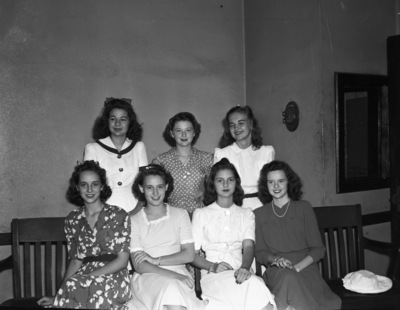 New officers are being elected to the D. O. S. Left to right on the front row are Misses Peggy Banner, Betty McGonagill, Barbara Von Zuben and Betty Lindsey. On the back row are Misses Martha Martin, George Ann Brown, and Beverly Montague. Miss Banner, president is wearing a floral dress. Miss McGonagill, treasurer, is wearing a dress with a lace collar. Miss Von Zuben, recording secretary, is dressed in a button-up blouse and a skirt. Miss Lindsey, corresponding secretary, is wearing a dress and a pearl necklace. Miss Martin, sergeant-at-arms, is dressed in a button-up blouse and a skirt. Miss Brown, reporter, is wearing a polka-dot dress. Miss Montague, parliamentarian, is dressed in a blouse and skirt. Published Fort Worth Star-Telegram Evening Edition September 9, 1941.