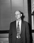 B. O. Lange, named assistant county purchasing agent, comes to the post with a background in the grocery and heavy machinery business and bookkeeping and cashier experience. He is standing in front of a window with the blinds shut, wearing a suit and eyeglasses. Published in the Fort Worth Star-Telegram Morning edition September 9 1941.
