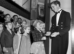 At the Twelfth Annual Big Time Party. Among the 10,000 youngsters who packed six neighborhood theaters Tuesday morning for twelfth annual Big Time Party given by Leonard's Department Store for school children were these early arrivals at the Tivoli Theater. Shown lined up to hand their tickets to Houston Moore, head usher, (far right), are Aurelia Ann Wall, Betty Alliene Wright, Ann Ellis, Averill, Betty Catherine Lackey, Ernest Colvin Lackey, Richard Denham, Eddie Denham and Claud Stewart. Each received candy and souvenir caps. Published in The Fort Worth Star-Telegram Evening Edition September 9, 1941.