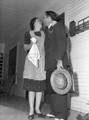 Mr. and Mrs. Cecil A. Singleton are kissing good-bye on their front porch as he heads off to work. It is the first time in twenty-nine years that Mrs. Singleton has missed a school opening. She spent twelve years as a teacher and one as a principal. Mr. Singleton is heading off to one of the schools where he serves as principal - George Clarke Elementary School and B. H. Carroll Elementary School. He is taking over the role his wife filled last year. Mrs. Singleton is wearing a floral dress and an apron. She is holding a cup and a dish rag. Mr. Singleton is dressed in a suit. He is carrying his hat and briefcase. Published Fort Worth Star-Telegram Morning Edition September 10, 1941.