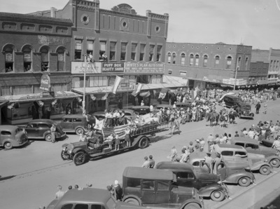 Parades & processions; Automobiles; Flags--United States; Business districts