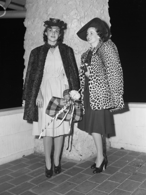 The Fair Store Style Show is being held at the River Crest Country Club in Fort Worth, Texas. The models are sporting some of the season's top new fashions. Pictured left to right are Miss Helen Cunningham and Miss Helen Jane Davis. Miss Cunningham is modeling a natural wool dress, brown Persian lamb coat, plaid purse, and a brown and blue hat. Miss Davis is wearing a green coffee two-piece suit with a matching big-brimmed hat, a leopard coat, and brown accessories.