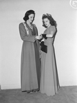 The Fair Store Style Show is being held at the River Crest Country Club in Fort Worth, Texas. The models are sporting some of the season's top new fashions. Pictured left to right are Mrs. J. C. Roberts and Miss Betty Lindsey. Mrs. Roberts is dressed in a long red fitted wool evening coat over a go-green gown. She is examining a gold bracelet on the wrist of Miss Lindsey. Miss Lindsey is wearing a gold dress with black and gold accessories, and a bow in her hair.