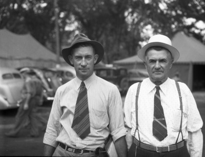 Left to to right, Frank Norrish and his father, R. A. Norrish, both of Morrison, Illinois. They are among the the major cattle feeders in Illinois. For years they have purchased their feeder supplies from members of the Highland Hereford Association near Marfa, Texas. They are standing outdoors. Behind them are several parked automobiles. Frank is wearing a pinstripe, collared shirt, necktie, hat, trousers and a belt. R. A. is wearing a polka-dot, collared shirt, necktie, hat, trousers, suspenders and a belt.
