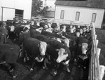 Cattle bred by the Scharbauer Company of Midland, Texas, and Millard Eidson of Lovington, New Mexico, that were on feed by Simeon Brenniman and Sons at Gomer, Ohio. The cattle are standing in a fenced-in area. In the background is a barn.