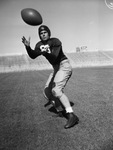 Bruce Alford is an end on the Texas Christian University football team. He is a former all-state performer in Waco, Texas. After a summer of hard work, the young man has gained fifteen pounds and now weighs 193-pounds. Alford is making a strong bid for a starting berth on the Frog line. He has improved his offensive work and shows advantage in early drills. Alford is dressed in his number 83 football uniform. He is on the football field, practicing catching passes. Published in the Fort Worth Star-Telegram morning edition, September 11, 1941.