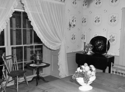 Views of the interior of Mr. and Mrs. R. K. Campbell, the design is a French Colonial home on Rockridge Terrace. Image is of the dining room, decorated with a pictured window curtained with draperies and a waxed red brick floor. Published in Fort Worth Star-Telegram morning edition September 28, 1941.