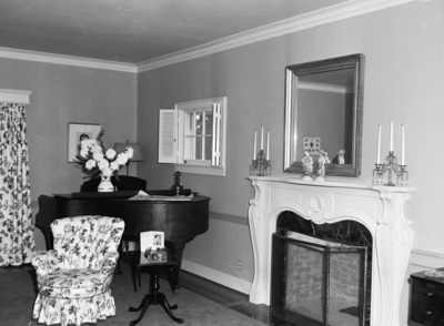 Views of the interior of Mr. and Mrs. R. K. Campbell, the design is a French Colonial home on Rockridge Terrace. Image is of the living room, furnished in the same French Colonial design as the rest of the house. It is decorated with shuttered window coverings and a folding French doors. Published in Fort Worth Star-Telegram morning edition September 28, 1941.