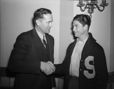 Manager Bob Linton, of the Fort Worth Cats baseball team, is greeting the Golden Glovers and welcoming them to Fort Worth. Linton, left, is shaking hands with Cy Rogers. Rogers is a middleweight from Southwestern University. He competed for the Golden Gloves in 1939 and just missed winning the state title. Linton is dressed in a three piece pinstripe suit. Rogers is wearing a button-up shirt, letterman jacket, and trousers.