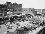 Image shows a crowd looking upon a parade at the fourth annual Johnson County Fair in Cleburne. In center is unidentified people on horse and a marching band. Published in the Fort Worth Star-Telegram evening edition September 11, 1941.