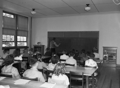The new Sagamore Hill Elementary School is opening their doors to begin the fall term. The old building was condemned and the new red brick school house took two years to complete. In the meantime, students attended school in the adjoining district. First Day of School is evident among the 172 students in all the rooms from first through sixth grade. Sixth grade teacher, Miss Mary Ferguson, is shown standing at the chalkboard. She is teaching her pupils about common denominators. Published Fort Worth Star-Telegram Morning Edition September 12, 1941.