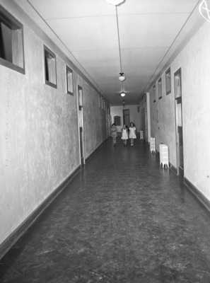The new Sagamore Hill Elementary School is opening their doors to begin the fall term. The old building was condemned and the new red brick school house took two years to complete. In the meantime, students attended school in the adjoining district. Strolling down a corridor on the first day in their new school are three fourth grade pupils. They are left to right Norma Jean Havenhill, Betty Ruth Tomkins, and Laura Ann Vickers. Published Fort Worth Star-Telegram Morning Edition September 12, 1941.