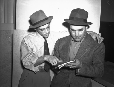 The Golden Gloves state tournament is being held at Will Rogers Memorial Coliseum in Fort Worth, Texas. Making his fourth trip to the state tournament is Phillip Benestante, left, and his coach Jimmy Delmar. Benestante is representing Houston, Texas in the tournament. He is wearing a hat, dress shirt, necktie, and trousers. Coach Delmar is dressed in a hat, collared shirt, blazer, and trousers.