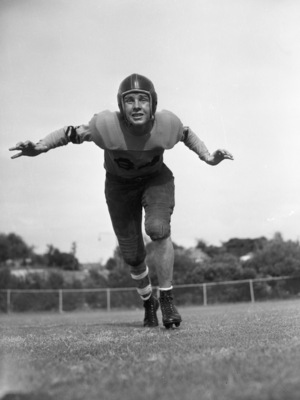 Frank Huffman is a guard on the Polytechnic High School football team. He has been named the hardest worker on the Parrots' squad, due to his effort in the fall workouts. He never missed a practice and showed up early most days. As a result, the 160-pound player was in great shape to start the season and earned his first letter. Huffman is shown on the practice field working on his blocking techniques. He is wearing a number 84 football uniform and a helmet. Published Star-Telegram Eve. Sep. 18, 1941.