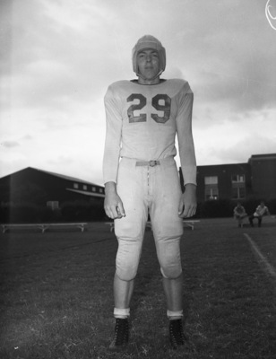 Harold Prescott is a football player at Hardin-Simmons University in Abilene, Texas. The 190-pound star plays end for the Cowboys. His skill at the position is one reason Coaches are not worried about end play. Prescott is shown standing on the practice field, dressed in a number 29 uniform and a helmet. A school building is in the background. "(Star-Telegram Photos by Tom Dillard.)" Published Star-Telegram Morn. Sep. 14, 1941.