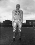 H. C. Burrus is a football player at Hardin-Simmons University in Abilene, Texas. The Cowboys are looking to continue the success of their undefeated 1940 season. The skinny, 180-pound end will play a major role for the Cowboys this season. The first year head coach, Warren Woodson, rated Burrus "one of the two greatest ends" he's coached. Burrus is shown standing on the practice field, dressed in a number 27 football uniform and a helmet. "(Star-Telegram Photos by Tom Dillard.)" Published Star-Telegram Morn. Sep. 14, 1941.
