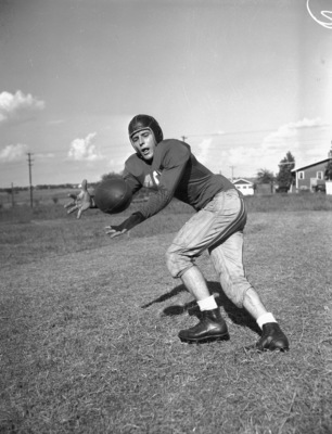 The Texas Wesleyan Rams football team is preparing for the opening game of the college football season. They are hosting the visiting Hardin-Simmons Cowboys, who were undefeated in the 1940 season. Veteran Ram wing back Oscar Weimann will be one of the keys to success. The 180-pound Junior is a native of Brenham, Texas. He is shown at practice, working on his specialty - pass catching. He is dressed in a number 40 football uniform and a helmet. Published Star-Telegram Morn. Sep. 14, 1941.