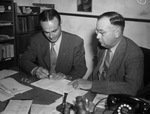 The Hardin-Simmons Cowboys are preparing for the 1941 football season. They are looking to continue the success of the unbeaten 1940 season. Discussing plays off the "T" formation, left to right are Coach Warren Woodson and Dr. W. R. White. Coach Woodson is in his first season as head coach of the Cowboys. He is dressed in a single-breasted suit with a checkered tie and wearing a wristwatch, a Kiwanis pin, and a tie pin and is holding a mechanical pencil. Dr. White is the university president and keenly interested in the football team. He is wearing a single-breasted suit, a broadly-woven diagonal-striped tie, a tie chain with an ornament, and rimless eyeglasses. There are books in bookshelves behind Woodson and on the desk is a pen holder and various carved or cast figures (including a bear and a cowboy hat) and a bakelite rotary dial telephone. Published Star-Telegram Morn. Sep. 14, 1941.