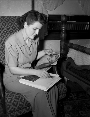 Mrs. J. Matt Walker, the former Miss Gladys Francisco, finds time during furnishing her new home at 3228 Travis Avenue, to indulge in several interesting hobbies, as well as in domestic duties. Mrs. Walker is seen to be keeping her scrapbook up to date and is shown about to place her wedding picture in it. Published in the Fort Worth Star-Telegram morning edition, September 21, 1941.