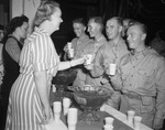 Soldiers from Camp Wolters are being entertained in Fort Worth, Texas. The Modernaries Club of the Young Men's Christian Associations (Y.M.C.A.) is hosting a dance for soldiers. Miss Ruth Lovell is serving punch left to right to Privates Roger Sizoo, George J. Chor, Walter F. Hubert, and Stanley Kokoski. All are from Chicago, Illinois and are dressed in their military uniforms. More than a hundred soldiers attended the dance. Published in Fort Worth Star-Telegram, evening edition, September 15, 1941.