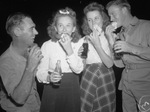 Soldiers from Camp Wolters are being entertained in Fort Worth, Texas. The Catholic Community Center is hosting a barbecue for the soldiers. Gorging on Polish sausages and bottles of Coca-Cola left to right are Private Byron Phares, Miss Margaret Lilly, Miss Leona Luke, and Private Donald W. Schultz. Private Phares, of Decatur, Illinois is dressed in a button-up shirt and trousers. Miss Lilly, twenty, is from Fort Worth, Texas. She is wearing a button-up shirt and a skirt. Miss Luke, of Dawn, Texas, is a student of Our Lady of Victory College. She is wearing a blouse and a plaid skirt. Private Schultz, of Wayne, Michigan, is dressed in his military uniform. Published in Fort Worth Star-Telegram, evening edition, September 15, 1941.