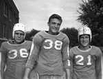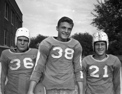 The Masonic Home High School football team is trying for their fourth straight district 7-AA Championship. Pictured, left to right, are Billy Joe Cagle, Louis Burress, and Jake Conner. Cagle and Burress, little rascals from the 1940 season, have grown into the husky, talented Masons backfield. Cagle (36) is a wing back. Burress (38) is a tailback. Jake Conner (21) is one of the youngsters on the team. Three clippings accompany the photo, each boy featured on a different day. For Louis Burress, it compares him as a local boy from Masonic Home who is a rival to "Marion Flanagan, Sweetwater's versatile halfback, [who] rested last week. And while he was idle a number of athletes gained considerable ground on him in the West and Central Texas schoolboy football scoring race. . . . Four other players with excellent chances of overtaking Flanagan are Buryl Baty, Paris' great passer and placement kicker; long-legged Louis Burress of Masonic Home. . . ." Published Star-Telegram Morn. Oct. 8, 1941. Billy Joe Cagle's photo also discusses competition with Marion Flanagan and other Texas players but the truncated clipping doesn't discuss Cagle. Published Star-Telegram Morn. Sep 17, 1941. The third truncated clipping header starts "Conner, Burress R. . . " and the clipping again doesn't contain the discussion of the young man featured in the photo. It isn't stamped with the publication date, but it may be Oct. 27, 1941, based upon the by-line on an article on the back of the clipping.