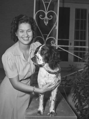 Mrs. Henry Palmros is posing on her front porch with her Springer Spaniel, "Silja." Mrs. Palmros is a member of the Junior Woman's Club. She is wearing a button-up dress. Silja is an entry in the Fort Worth Kennel Club dog show, which is being held on October 4 at the Pioneer Palace.