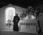 Reverend John Maher is the pastor of All Saints Catholic Church. He is shown Sunday night during the dedication ceremony of a new shrine. The shrine was presented by his parishioners on his 30th anniversary of priesthood. The Virgin Mary statue in the recess of the shrine was given to the church by the W. H. Sparger family. Reverend Maher is dressed in his clerical robe.