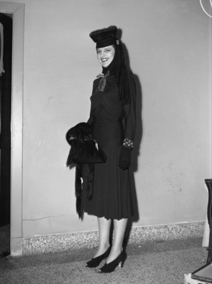 The Fair Store Style Show is being held at the Baker Hotel in Mineral Wells, Texas. The models are sporting some of the season's top new fashions. Miss Mary Chesney is standing in front of a wall, before walking down the runway. She is wearing a Hattie Carnegie middy dress of black coffee brown, a fur-trimmed snood hat, black accessories, gloves, and a purse.