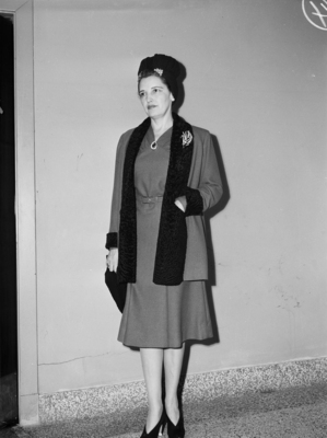 The Fair Store Style Show is being held at the Baker Hotel in Mineral Wells, Texas. The models are sporting some of the season's top new fashions. Mrs. John A. Connelley is wearing a blue wool suit dress, a blazer with a brown broad-tail tuxedo collar, matching brown accessories, and pearl clips in her hat.