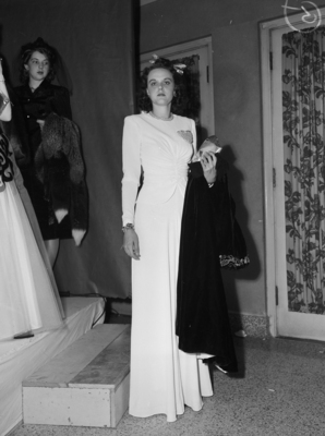 The Fair Store Style Show is being held at the Baker Hotel in Mineral Wells, Texas. The models are sporting some of the season's top new fashions. Miss Peggy Fite is wearing a white matte jersey gown with pearl beaded trim and gold accessories. A full length black wool evening coat is draped over her arm. There is a woman modeling on the stage in the background.