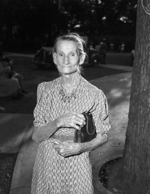 The Fort Worth Half Century Club gave special recognition to three long-time residents of Tarrant County, Texas at a barbecue and outing. One of the honored members is Mrs. Sarah Jane Shea. At ninety-one years old, she is the second oldest person in attendance, and the oldest woman. She is standing under a shade tree, wearing a dress belted at the waste. Her purse is tucked underneath her arm. Published in the Fort Worth Star-Telegram morning edition, September 14, 1941.