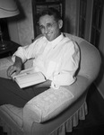 Millard A. Elliott is retiring after thirty-eight years as a railway postal clerk. He is settling in at home to relax and do some reading in his favorite easy chair. He also plans to do some fishing in his retirement. He is dressed in a button-up shirt with cuffed sleeves and trousers. Published in the Fort Worth Star-Telegram morning edition, September 16, 1941.