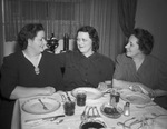The Hotel Texas is holding a farewell luncheon for Mrs. Clarice Roach, the chief operator and the "personality voice" of the hotel. Pictured at the luncheon, left to right, are Mrs. Anna Bills, Mrs. Roach, and Mrs. Mary Lou Donaldson. Mrs. Bills is taking over as the new chief operator. She is wearing a dress with a brooch. Mrs. Roach is retiring after 15 years and is moving to Los Angeles, California. She is dressed in a button-up blouse. Mrs. Donaldson is the hostess of the farewell luncheon. She is wearing a collared dress.