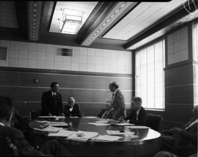 Fort Worth City Council budget hearing with (left to right) Councilmen Henry Woods, Marvin D. Evans, L. C. Trimble, Roscoe Carnrike, and E. S. Birdsong. Clipping reads: "Councilmen Woods and Carnrike faced each other across the City Council table at the height of a tense hearing on the 1941-1942 city budget. Woods included criticism of City Manager Bothwell in his attack on the proposed 8-cent tax increase in the budget, with Carnrike undertaking to defend the manager." Published in the Fort Worth Star-Telegram evening edition, September 17, 1941.