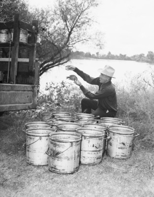 Lake Como. Bob Calen shown comparing on of the tiny new fish with a bream caught out of Lake Como with one of those to be used to restock the lake. Some of the patented "air-conditioned" metal containers in which the hatcheries now transfer fish are shown in the foreground. Published on September 17, 1941.