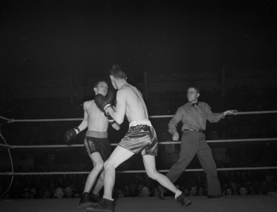 The Golden Gloves state tournament opened Thursday night at Will Rogers Memorial Coliseum in front of a crowd of 3,500. Squaring off in the ring left to right are Sonny Boy Roberts of Stephenville, Texas and Jack Osteene of Tyler, Texas. Roberts is shown taking a right-cross from Osteene. The referee, Joe Elder, and the judges earned a roof lifting "boo" when they declared Roberts the winner of the close fight.