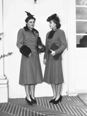 The Colonial Country Club in Fort Worth, Texas, is holding a fashion show to display women's clothes for wearing inside the home and out of the home. Modeling designs, left to right, are Mrs. Robert Young and Miss Mary Ellen Lilly. Mrs. Young is wearing a coat with a fur collar and cuffs. Miss Lilly is modeling a beaver tan wool jacket with a mink tail jabot. The jersey tricorne hat is lined with fur.