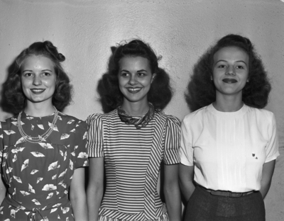 Paschal High School is announcing the cadet aides for the Reserve Officers' Training Corps (R. O. T. C.). Some of the student leaders, left to right, are Miss Bettye June Thompson, Miss Junene Doak, and Miss Betty Jo Copeland. Miss Thompson is wearing a floral dress and a pearl necklace. Miss Doak is wearing a striped dress with a necklace. Miss Copeland is dressed in a blouse and a skirt.
