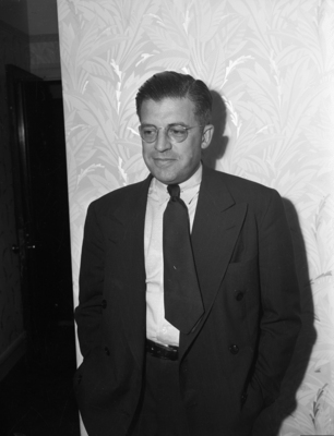 Robert J. Bauer is in Fort Worth, Texas, to address a luncheon as the principal speaker. The luncheon is in observance of "Retailers for Defense Week" in Fort Worth. Mr. Bauer is the manager of the Los Angeles Better Business Bureau. He is shown standing against a wall, dressed in a double breasted suit.