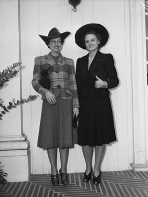 The Colonial Country Club in Fort Worth, Texas, is holding a fashion show to display women's clothes for wearing inside the home and out of the home. Modeling designs, left to right, are Mrs. W. T. Waggoner II and Mrs. W. R. Nail. Mrs. Waggoner is wearing a brown and blue plaid jacket over a high-necked brown wool dress. The outfit is accessorized with a swooping brimmed tweed hat, brown suede bag, and gloves. Mrs. Nail is wearing a five-o'clock black wool suit trimmed with soutache braid. Accompanying the suit is a mushroom-brimmed hat, black bag, and gloves.