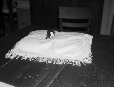A Boston Terrier puppy that weighs four ounces at the end of three weeks of life is being raised by Mrs. E. Watson. The puppy is fed goat milk and whiskey from a spoon. It is the smallest Mrs. Watson has seen in 15 years of breeding Bostons. The dog is predominantly from the Hagerty strain of Bostons and the sire and dam are owned by Mrs. G. W. Thurman. The puppy is resting on a pillow on the floor.
