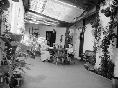 Mrs. D. M. White, mother of Mrs. Iva Mae Morris, and Carl Reimers, a pupil of Mr. Brooks Morris, are seated at a table in the sunlit patio which centers off the front rooms of Mr. and Mrs. Morris' new home, the new studio at the rear, and a passageway leading to Mrs. Morris' antique shop which will formally open soon.