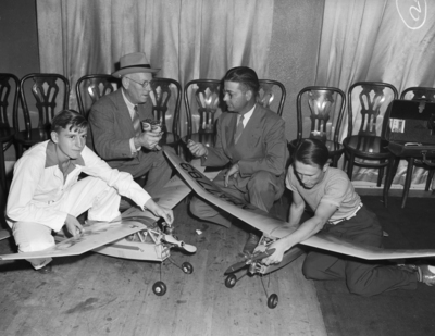 The Junior Chamber of Commerce is holding a luncheon meeting at the Blackstone Hotel. On display are Gas Model Planes, expected to attract 200 contestants. Working on their model planes left to right are Chas Crabtree, Roscoe C. Smith, J. H. Brooks and Chas Seyster. Mr. Crabtree is wearing coveralls. Mr. Smith is dressed in a hat and a pinstripe suit. Mr. Brooks is wearing a double breasted suit. Mr. Seyster is wearing a t-shirt and trousers. There are a row of chairs positioned against the back wall.
