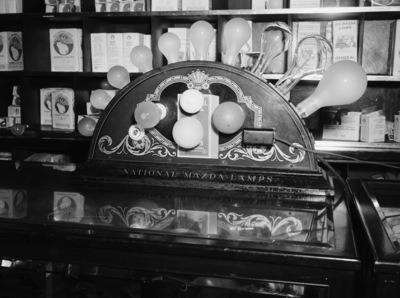 To raise the $3,553,000,000 defense revenue contemplated in the tax bill passed by the Congress and sent to the President for signature, many commodities small and big will be looked at closely. For each light bulb purchased after October 1, 1941 there will be a 5% additional charge for the defense fund, if the President signs the tax bill. On the store counter is a cluster of light bulbs on a display mount of National Mazda Lamps. There are other bulb packages on the shelves in the background. Published in the Fort Worth Star-Telegram evening edition, September 18, 1941.