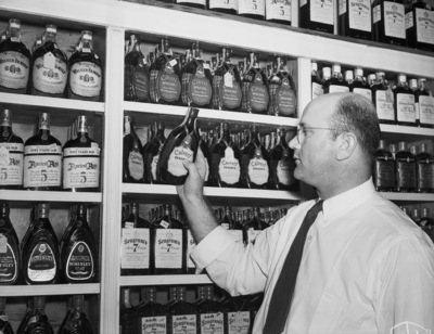 To raise the $3,553,000,000 defense revenue contemplated in the tax bill passed by the Congress and sent to the President for signature, many commodities small and big will be looked at closely. Tax on liquors will be up to $4.00 a gallon from the present $3.00. Sidney Rubenstein of the Shamrock Package Store, is seen checking over liquor stock that will assume new tax value. The store shelves are filled with bottles of liquor. Published in the Fort Worth Star-Telegram evening edition, September 18, 1941.