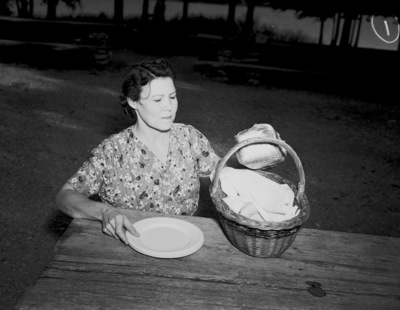 The Methodist annual picnic was held just west of the Lake Worth Casino, September 18, Thursday. One of the highlights was the lunch basket, over which Mrs. M. M. Chunn is presiding. She is taking out food contents of a packed picnic basket while she sits at the picnic table. Published in the Fort Worth Star-Telegram morning edition, September 19, 1941.