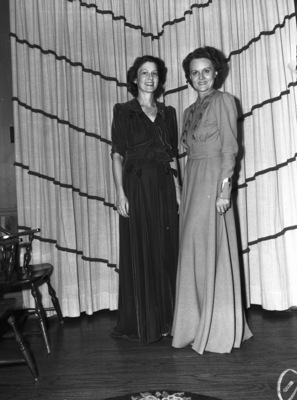 The Colonial Country Club in Fort Worth, Texas, is holding a fashion show to display women's clothes for wearing inside the home and out of the home. Modeling designs, left to right, are Mrs. E. J. McCurdy Junior and Mrs. W. R. Nail. Mrs. McCurdy is wearing a hostess robe of red velvet with draped fullness. Mrs. Nail is modeling a hostess coat of chiffon-weight, all wool flannel with gold trim. It is fitted at the waist and has a full skirt.